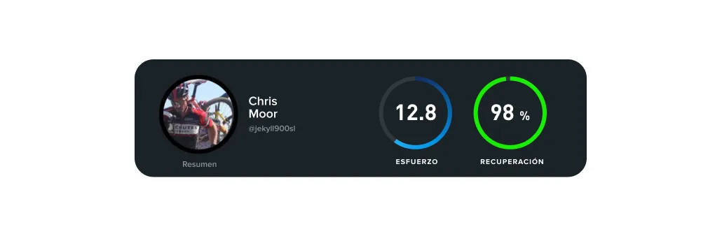 Durante los últimos 6 meses, Chris ha tenido una Recuperación diaria promedio del 75% y no tuvo ninguna en rojo en ese tiempo. “Sobreentrenar o tener una baja Recuperación es una de las cosas más difíciles que me han ocurrido. Pasé de entrenar de 12 a 15 horas semanales, a apenas poder completar 6 horas algunas semanas. La Correa de WHOOP ha sido una gran herramienta para aprender a equilibrar mi fitness y mi Recuperación. Además de dormir lo que necesito, me tomo un día libre cuando caigo en amarillo durante más de un día. Aprovecho mis días verdes para dar un recorrido más largo o más duro”.