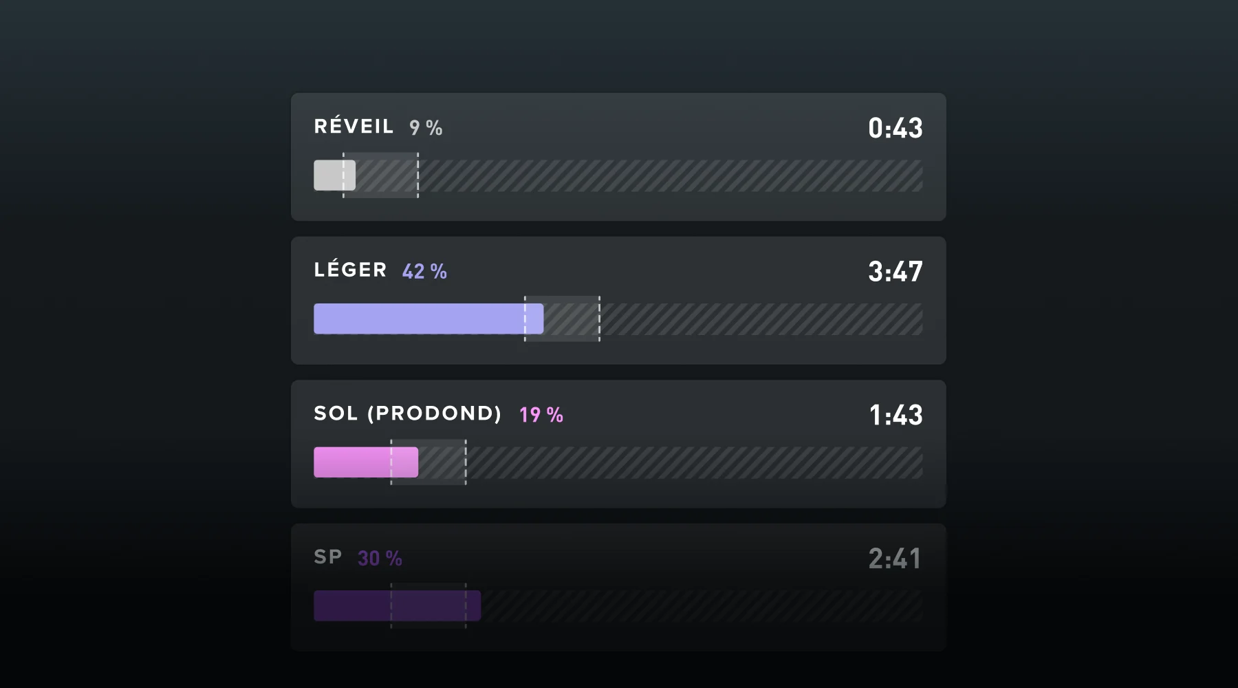 Après plus de deux ans de recherche à l’aide de données de polysomnographie (PSG) de grande qualité provenant de l’Université de Central Queensland (CQU) et de l’Université d’Arizona, WHOOP mesure encore mieux les stades du sommeil (éveil, , sommeil paradoxal léger et sommeil profond), ce qui fait que vos données de sommeil reflètent toujours plus fidèlement la façon dont votre corps se repose et se rétablit. Voici à quoi s’attendre :