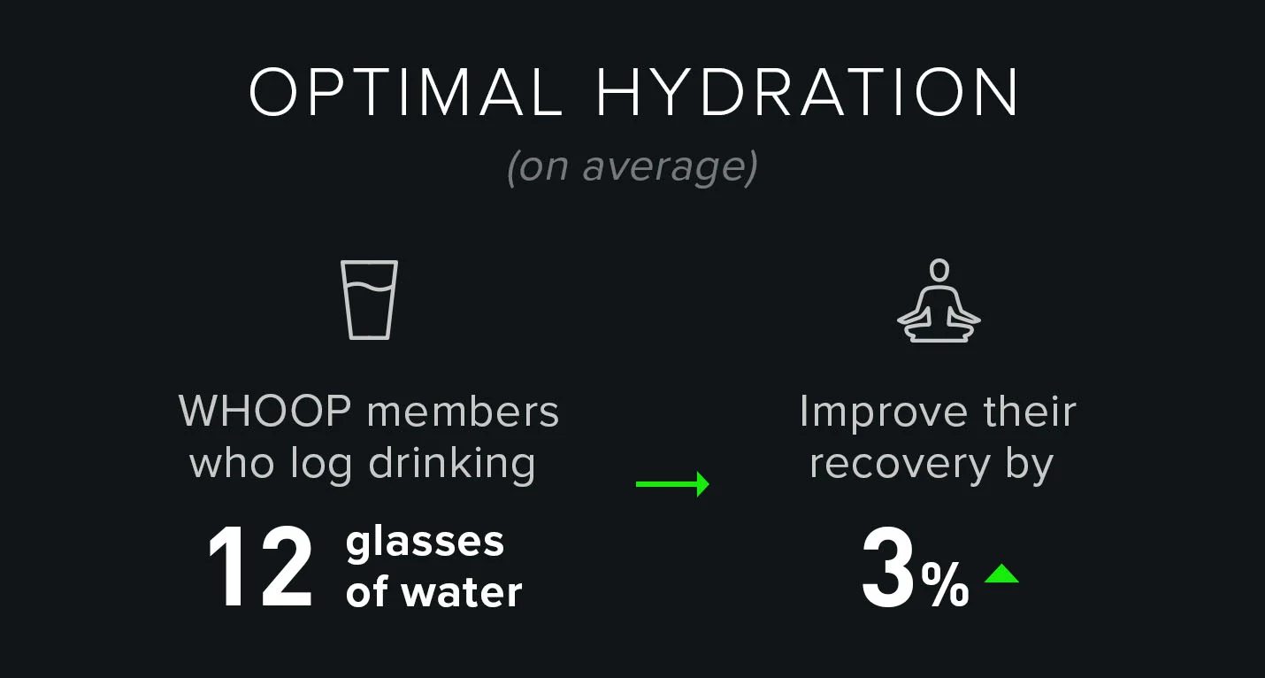 When WHOOP members report drinking 12 glasses of water they see notable benefits in their recovery the next day.