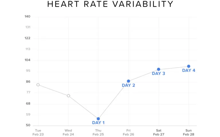 Jess and Nelly were back-to-back champions to start the 2021 LPGA season. The first tournament on the calendar was in Orlando, FL beginning on January 21. On Day 1, Jess had an 88% recovery and a phenomenal HRV of 210 milliseconds, well above her baseline average of 143 (HRV stands for heart rate variability, an extremely useful metric when it comes to physical fitness). Her resting heart rate was also trending downwards, another great sign, hitting a two-week low of 43 beats per minute: