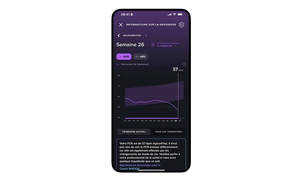 La grossesse est une étape de la vie unique qui s’accompagne de challenges particuliers, et durant laquelle chaque semaine représente un cap majeur. Les femmes enceintes de la communauté WHOOP peuvent utiliser la fonctionnalité « Informations sur la grossesse » pour saisir la date prévue de leur accouchement dès la 5ème semaine et recevoir des données et conseils personnalisés. Cette fonctionnalité met également à leur disposition des informations supplémentaires sur l’évolution des besoins de leur corps, en leur indiquant par exemple qu’il leur faut plus de repos, une meilleure hydratation ou des exercices physiques spécifiques. Vous pourrez suivre vos tendances de fréquence cardiaque au repos (FCR) et de variabilité de la fréquence cardiaque (VFC) au cours de chaque trimestre en se basant sur vos valeurs de référence. Dans la mesure où ces indicateurs évoluent considérablement au fil de la grossesse, WHOOP proposera des lignes tendancielles permettant à chacune de comparer l’évolution de ses propres données à celle qu’observent les autres femmes enceintes de la communauté WHOOP qui partagent le même profil.