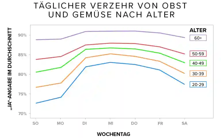 Bei der Analyse nach Altersgruppen zeichnete sich ein weiterer klarer Trend in den Daten ab: Mit zunehmendem Alter verteilt sich der Verzehr von Obst und Gemüse immer gleichmäßiger über die Woche. Dies deutet darauf hin, dass ältere Mitglieder konsequenter auf ihren täglichen Obst- und Gemüsekonsum achten, während sich jüngere am Wochenende häufig weniger gesund ernähren. In diesem Zusammenhang zeigte sich auch, dass mit zunehmendem Alter der Mitglieder auch die Wahrscheinlichkeit steigt, dass sie jeden Tag Obst und Gemüse zu sich nehmen.