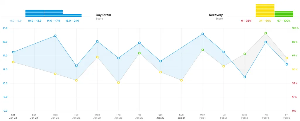 As you can see below in the screenshot of Kira’s data from January and February of 2016, she adapted her Strain to what her body could handle. Her high and low Strain days (in blue) coincided with her high and low Recoveries (green and yellow):